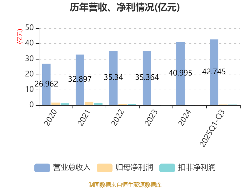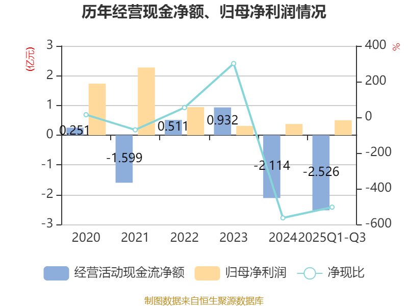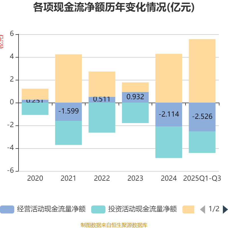 2025年前三季度,公司经营活动现金流净额为-2.53亿元,同比减少1.94亿元;筹资活动现金流净额5.57亿元,同比增加3.37亿元;投资活动现金流净额-1.89亿元,上年同期为-2.04亿元。