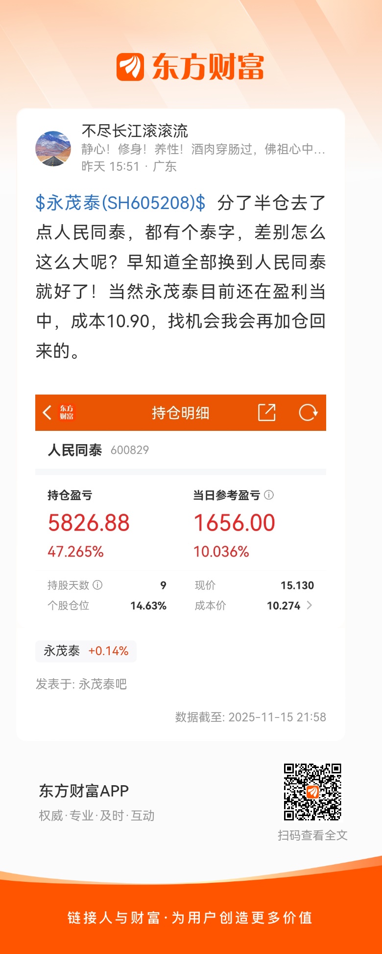 $永茂泰(SH605208)$ 分了半仓去了点人民同泰,都有个泰字,差别怎么这么大呢?早知道全部换到人民同泰就好了!当然永茂泰目前还在盈利当中,成本10.90,找机会我会再加仓回来的。