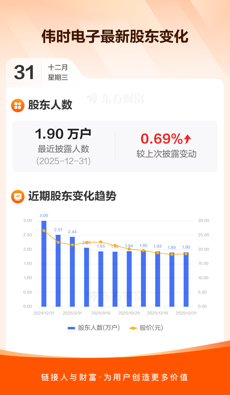 伟时电子:截至12月31日最新股东户数1.90万户,较上期增加0.69%