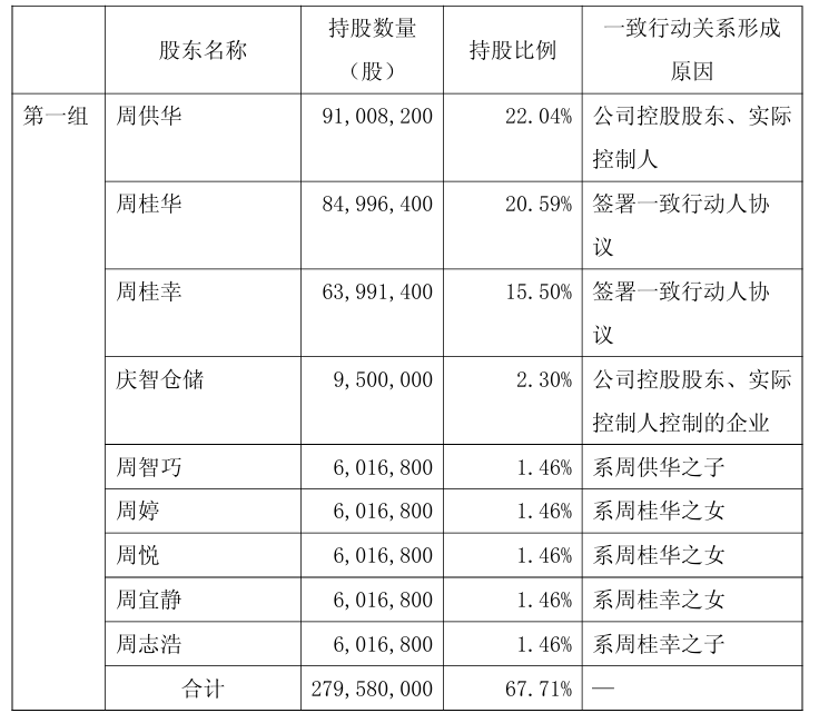 据悉,周供华系公司副董事长及总经理,周桂幸系公司副董事长,周桂华为公司法定代表人及董事长,周供华、周桂华、周桂幸三人为兄弟关系,均为公司控股股东、实际控制人,周供华、周桂华、周桂幸合计持有庆智仓储100%股权,并签署了一致行动人协议。周婷、周悦为周桂华之女,周宜静为周桂幸之女,周志浩为周桂幸之子,周智巧为周供华之子。
