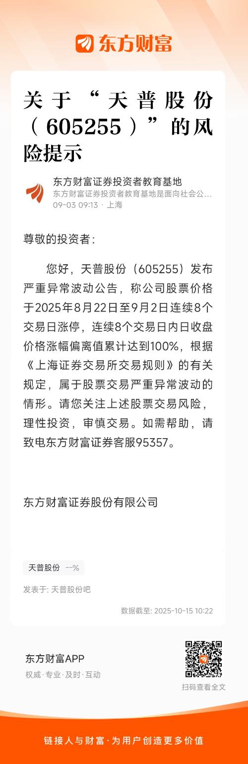 您好,天普股份(605255)发布严重异常波动公告,称公司股票价格于2025年8月22日至9月2日连续8个交易日涨停,连续8个交易日内日收盘价格涨幅偏离值累计达到100%,根据《上海证券交易所交易规则》的有关规定,属于股票交易严重异常波动的情形。请您关注上述股票交易风险,理性投资,审慎交易。如需帮助,请致电东方财富证券客服95357。