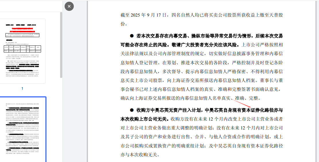 9 月 17 日晚间,天普股份发布公告称,经公司自查,截至公告日,收购方中昊芯英无资产注入计划,中昊芯英自身现有资本证券化路径亦与本次收购公司无关。