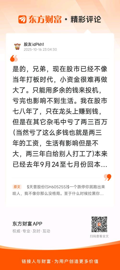 买真正的龙头才行。//@股友idPkh1 :是的,兄弟,现在股市已经不像当年打板时代,小资金很难再做大了。只能用多余的钱来投机,亏完也影响不到生活。我在股市七八年了,只在龙头上赚到钱,但是在其它杂毛中亏了两三百万(当然亏了这么多钱也就是两三年的工资,生活有影响但是不大,两三年白给别人打工了)本来已经去年9月24至七月份回本了百万,但是在这两个月机构行情中又亏回去了(亏在打高板和太格局)。天普割完我就会退出,人生重点是工作和生活,而不是被这种扭曲大A支配. 祝兄弟工作生活一切顺利.