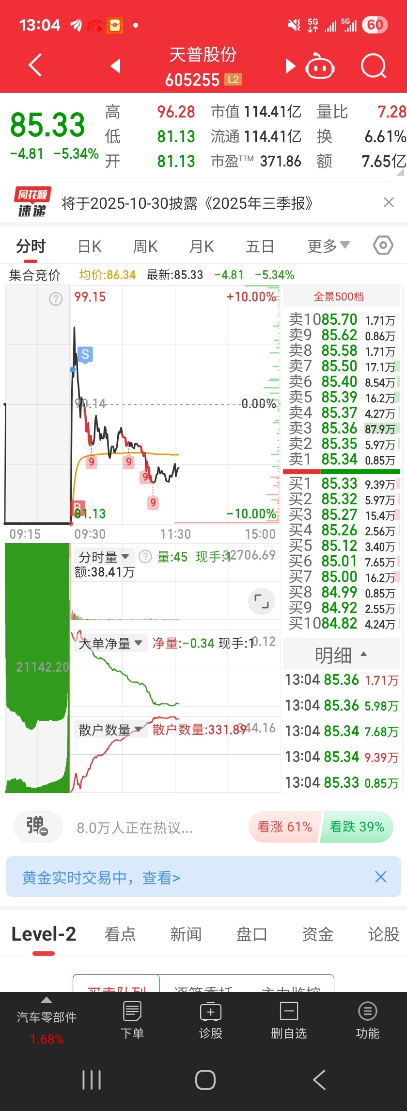 $天普股份(SH605255)$ 凭一己之力带崩大盘!盘尾接了个先手利润都给我搞没了……马上到生命线了,周一恐慌情绪也该差不多了,是定生死的时候了。这个票也是老派操盘手法。看看是不是当初师傅说的一样?真正进场应该重点等待周一,正好股价打到操盘线,我看你护不护你的生命线?挺有意思!唱空唱多都没意义,我就是想验证师傅教的!