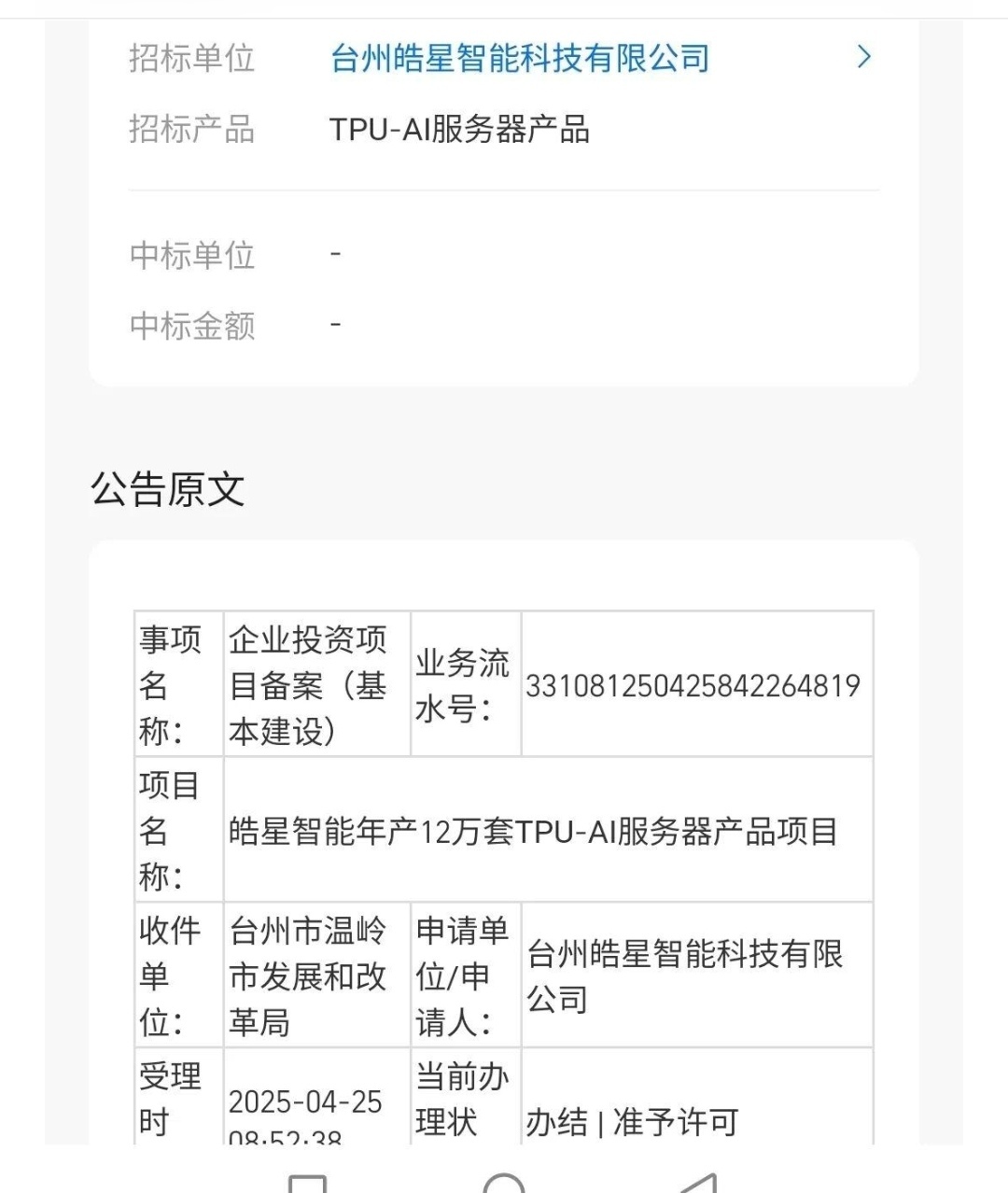 中昊温岭年营收1200亿!25日的皓星智能(中昊芯英分公司)企业投资项目备案名,号称年产12万套TPU-AI服务器!