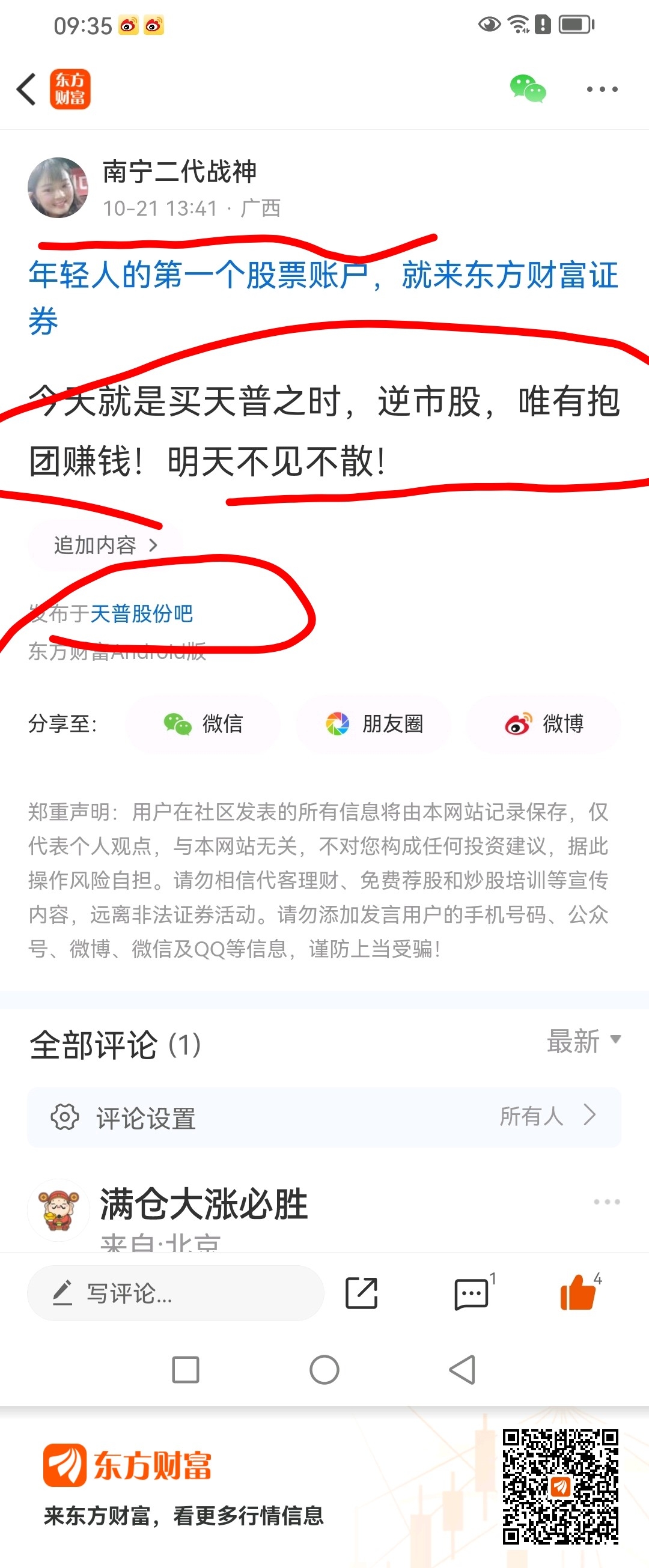 温馨提示: 1.根据《证券法》规定,禁止编造、传播虚假信息或者误导性信息,扰乱证券市场;2.用户在本社区发表的所有资料、言论等仅代表个人观点,与本网站立场无关,不对您构成任何投资建议。用户应基于自己的独立判断,自行决定证券投资并承担相应风险。《东方财富社区管理规定》