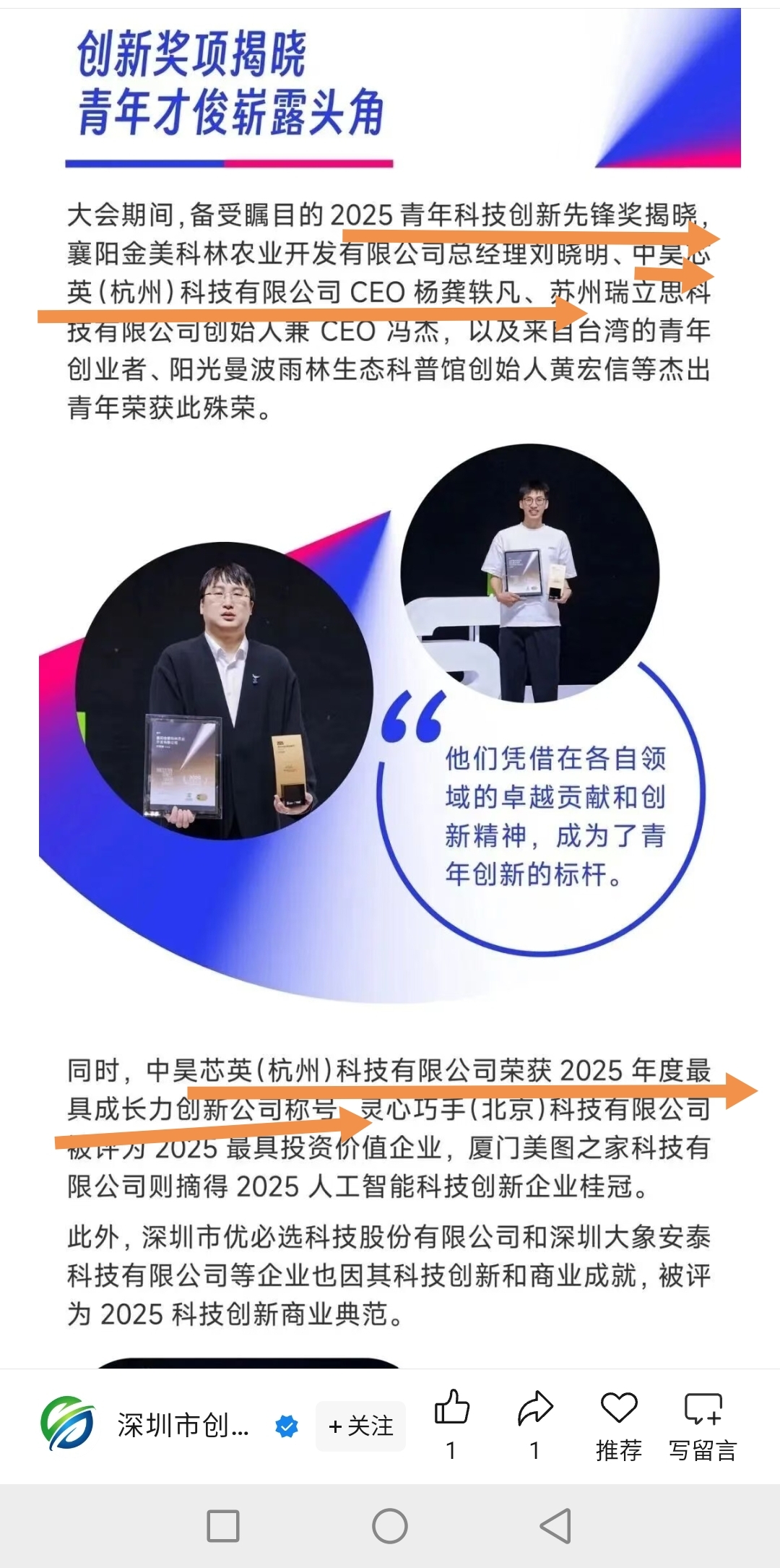 据“国际青年可持续创新大会”官方公众号,杨获青年科技创新先锋奖,中昊芯英获最具成