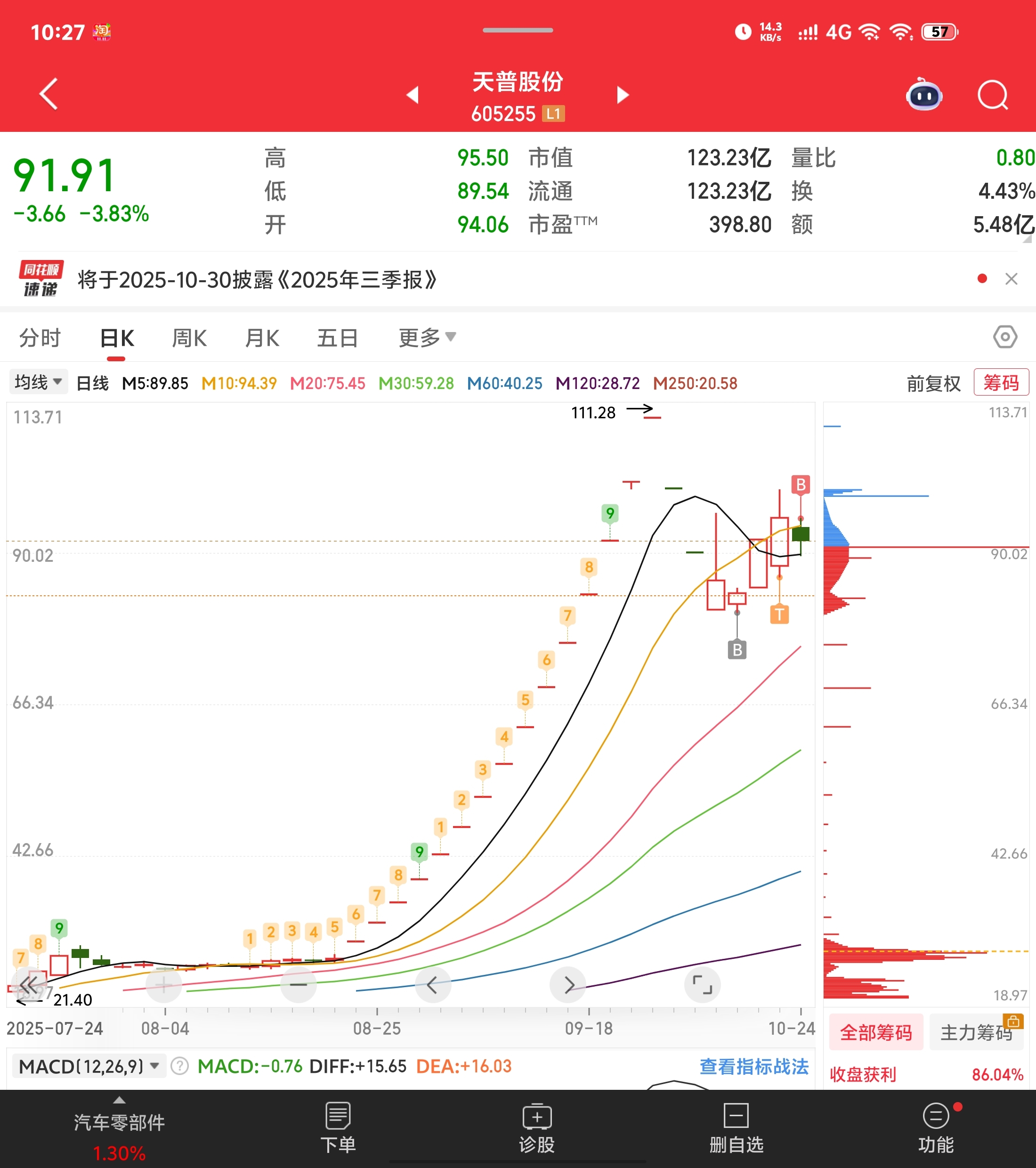 $天普股份(SH605255)$ 上周回顾:周二抄了个底,周四开盘88加了仓,周五继续加,暂时盈利。上纬下周要约收购完成,而天普按进度应该是十一月中旬完成和上纬一样,大股东花几十亿不是来玩的。想再低位抢筹码的估计是会踏空,因为八十就是铁底了。耐心持股必有厚报!