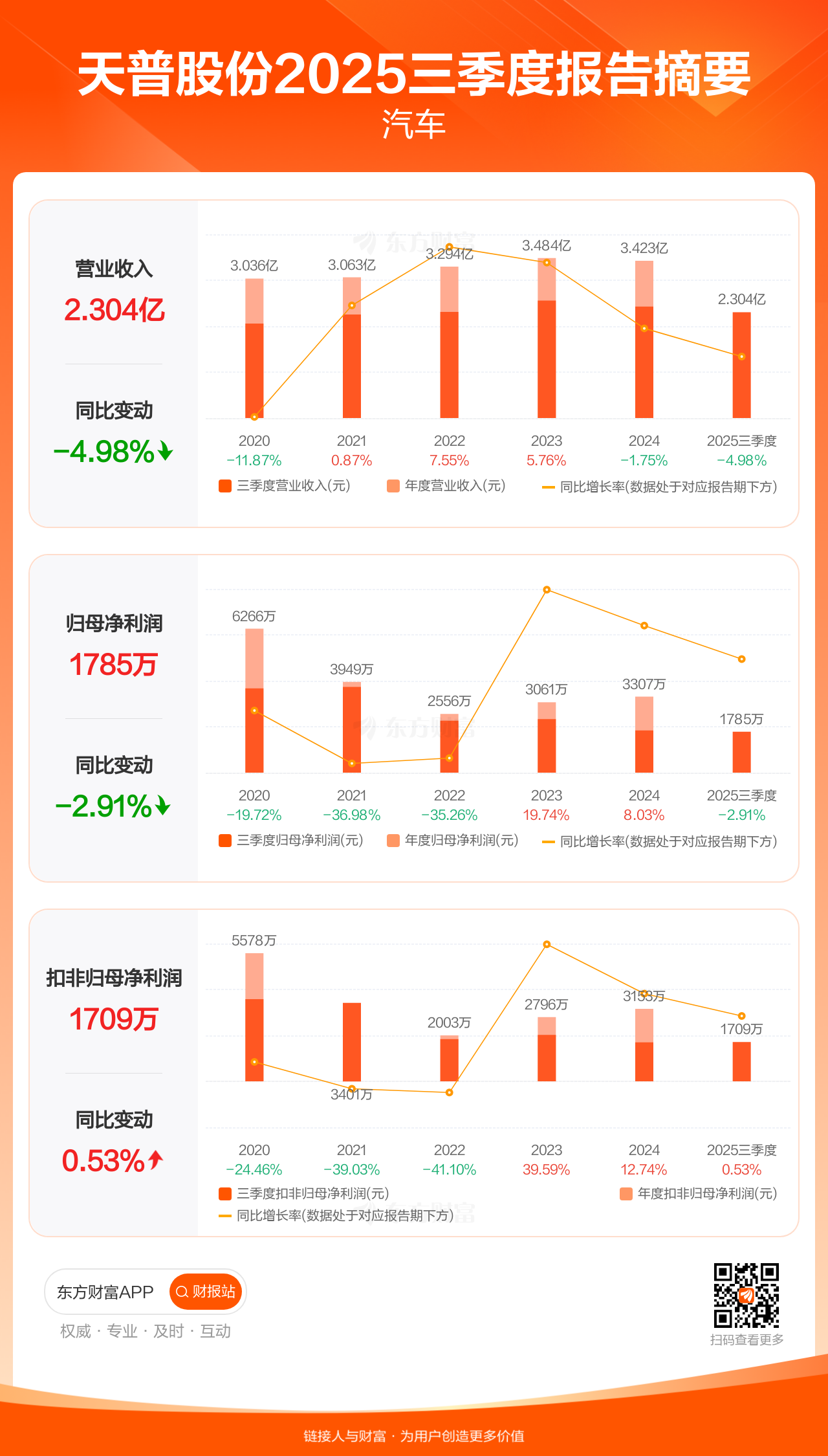 天普股份10月30日发布2025年三季报显示,公司前三季实现营业收入2.30亿元,同比下滑4.98%;归母净利润1785.08万元,同比下滑2.91%;扣非归母净利润1708.88万元,同比增长0.53%。