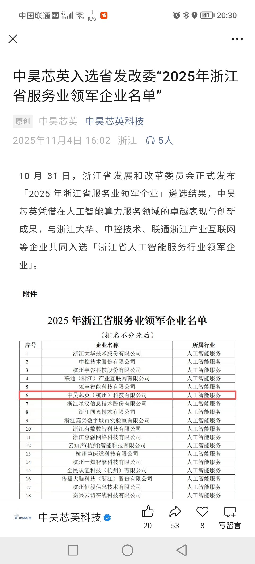 中昊芯英官方新文:公众号入选省发改委“2025年浙江省服务业领军企业名单”。我早