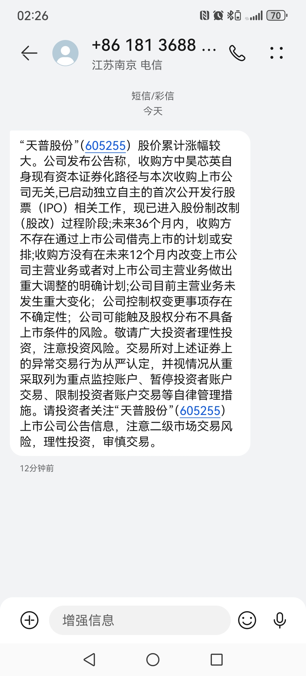 $天普股份(SH605255)$ 这是死活不让涨啊!才几手的底仓都要被证券公司发信息提醒!