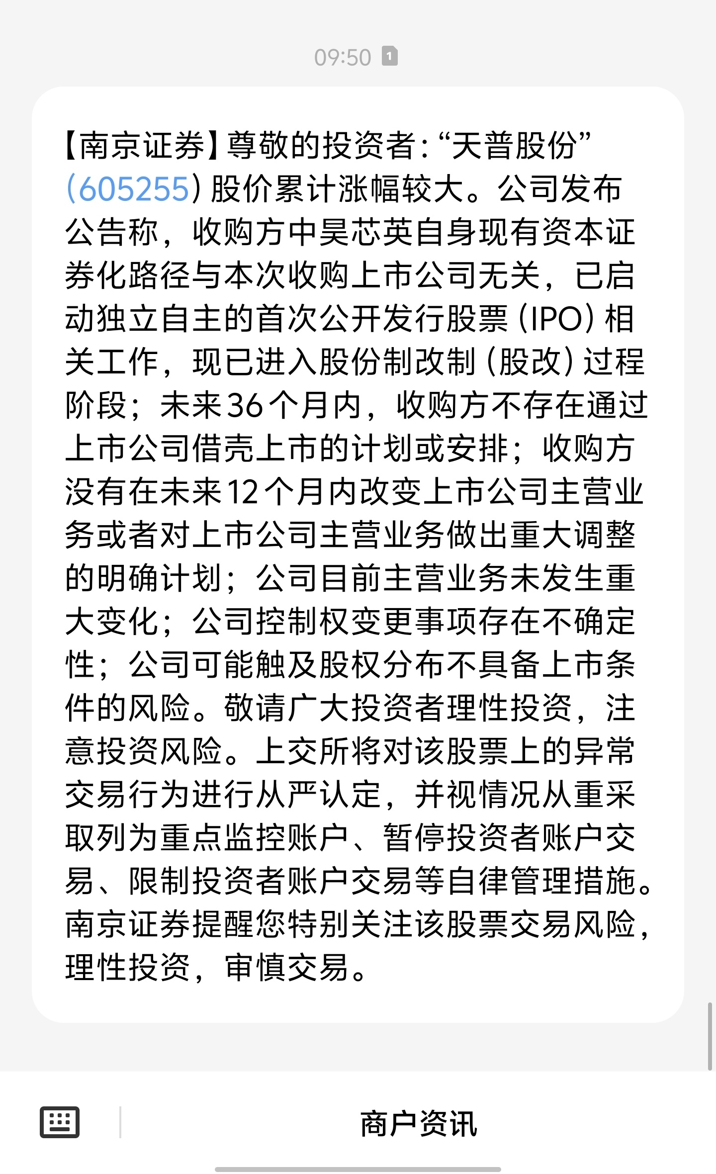 $天普股份(SH605255)$ 早上收到的短信,这样是不是大资金进不来了啊??