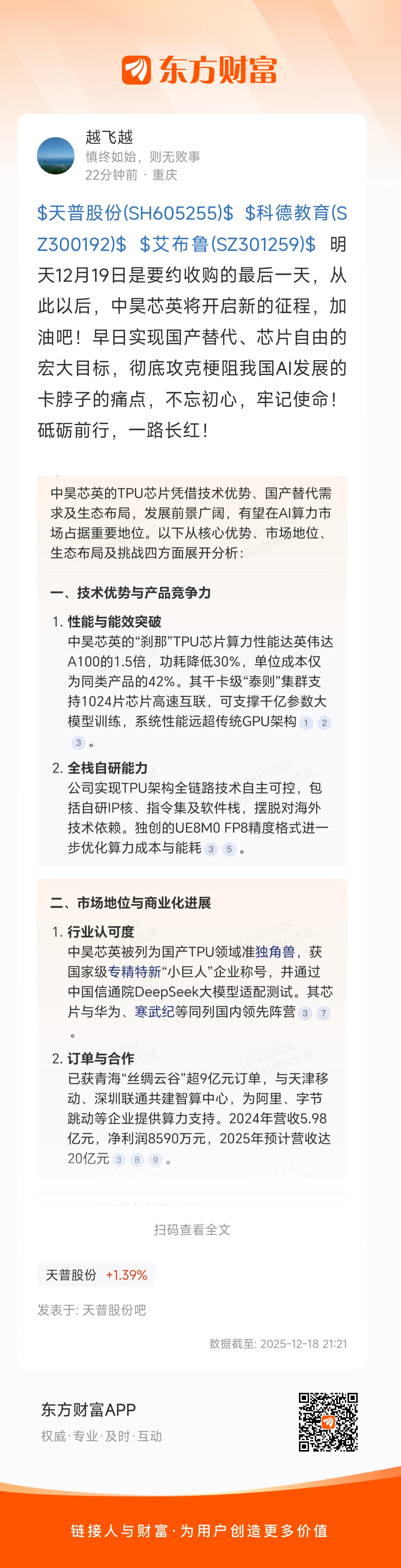 $天普股份(SH605255)$ $科德教育(SZ300192)$ $艾布鲁(SZ301259)$ 明天12月19日是要约收购的最后一天,从此以后,中昊芯英将开启新的征程,加油吧!早日实现国产替代、芯片自由的宏大目标,彻底攻克梗阻我国AI发展的卡脖子的痛点,不忘初心,牢记使命!砥砺前行,一路长红!