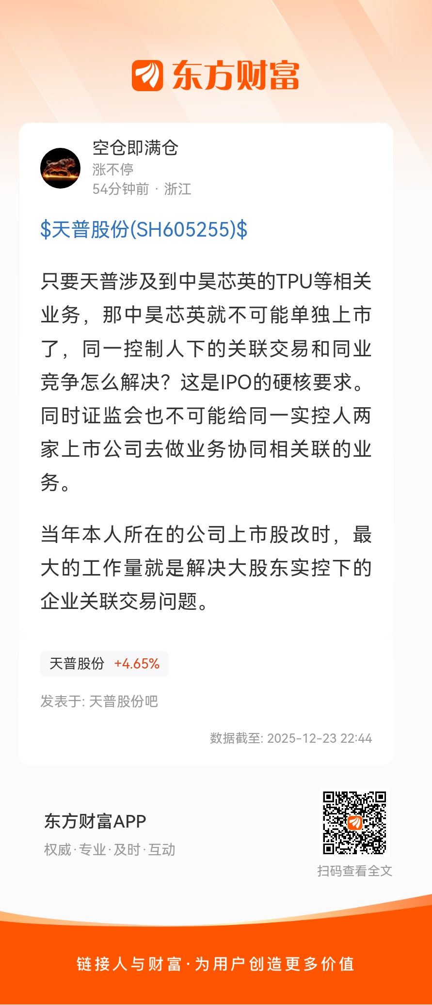 只要天普涉及到中昊芯英的TPU等相关业务,那中昊芯英就不可能单独上市了,同一控制人下的关联交易和同业竞争怎么解决?这是IPO的硬核要求。同时证监会也不可能给同一实控人两家上市公司去做业务协同相关联的业务。