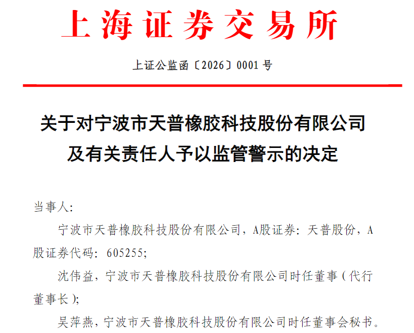 1月5日晚,天普股份(605255.SH)收到上海证券交易所下发的监管警示函,公司因利用子公司经营范围炒作人工智能概念,信息披露不准确、不完整,风险提示不充分,公司和时任董事(代行董事长)沈伟益、董秘吴萍燕均被予以监管警示。该函文号为“0001”,为2026年沪市首份监管警示函。