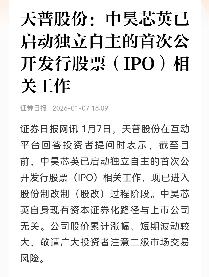 $天普股份(SH605255)$ $科德教育(SZ300192)$ $艾布鲁(SZ301259)$ 说要点:一、上交所要求天普股份在1个月内提交整改报告,复牌时间应该在提交整改报告并经上交所同意后。二、中昊芯英借壳或变相借壳天普股份的企图彻底泡汤。三、中昊芯英现在只剩下华山一条道,就是独立IPO上市,不论这条道有多么艰难,也只能咬紧牙关拼尽全力走到底。四、任何一点小聪明小心思小宵想都不能重新再有,否则,后果很严重。五、殷鉴不远,在夏后之世。如果,不信?请参考中潜退!