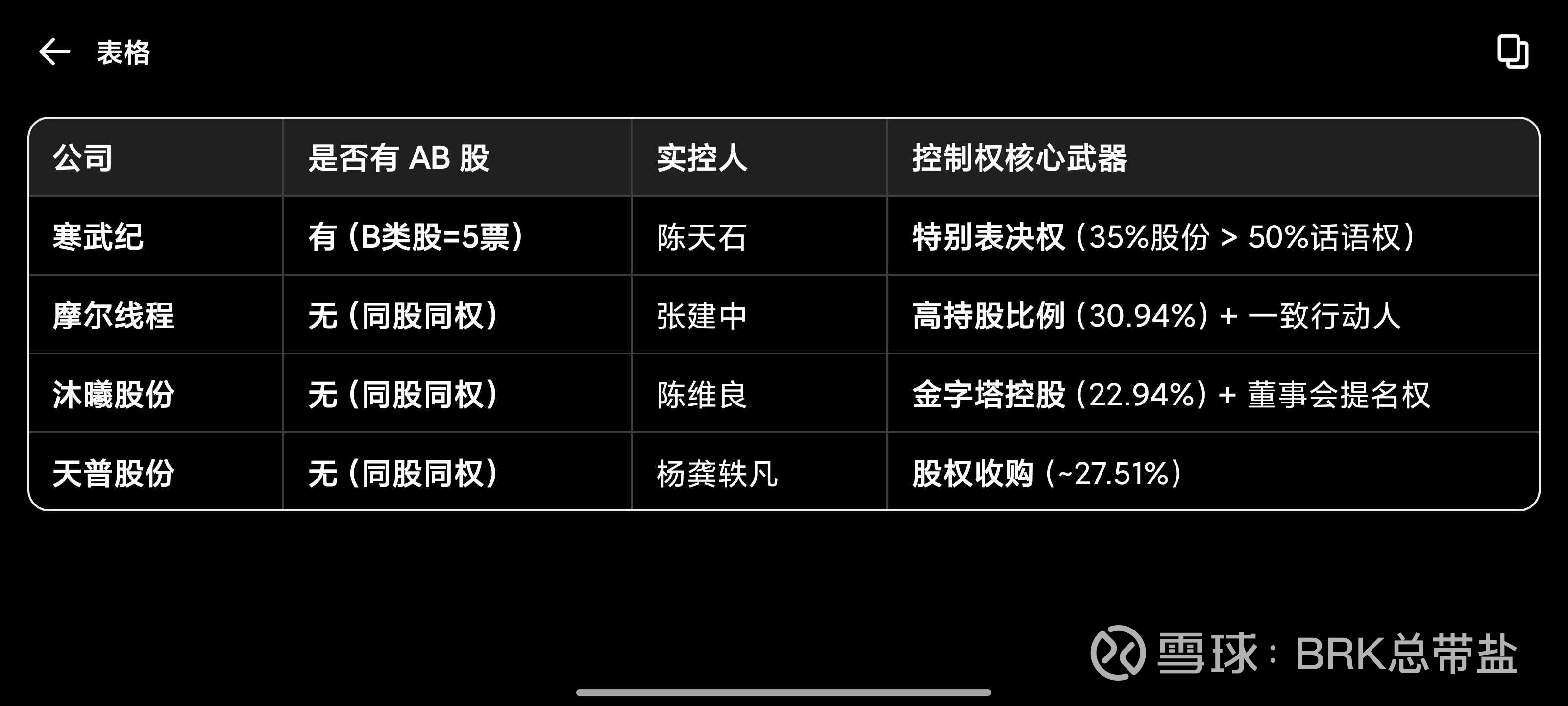 特别注意!这次摩尔和沐曦上市都没有像寒武纪一样设置特别投票权,因为他们1、不敢设(门槛高): 担心因为架构问题增加IPO审核的不确定性。2、不能设(融资难): 为了迎合国资和产业资本的出资要求,必须在股权结构上保持“公平”。3、不必设(团队稳): 员工持股平台早就建立,公司治理结构比较完善,且处于急需资金扩张的阶段,融资比死守控制权更重要。