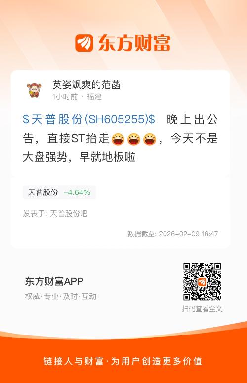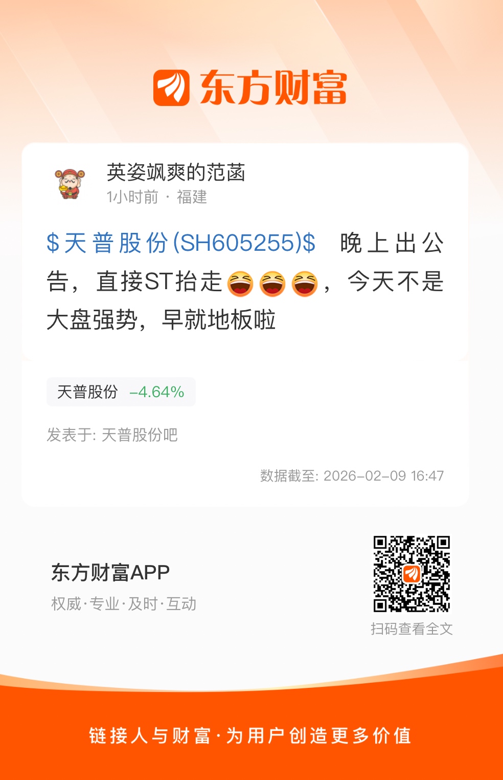 $天普股份(SH605255)$  晚上出公告,直接ST抬走,今天不是大盘强势,早就地板啦