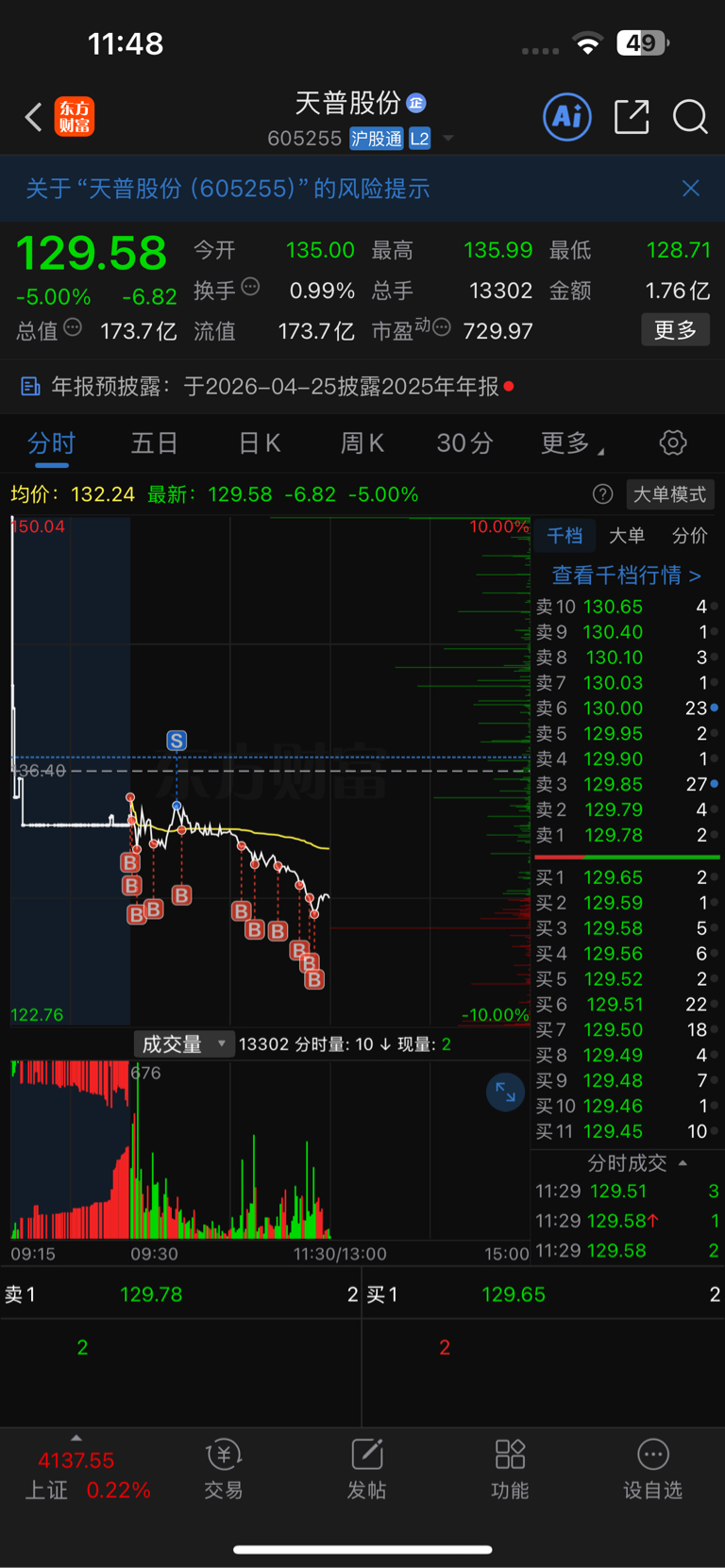 $天普股份(SH605255)$ 买买买,上次杀到128也是这样操作