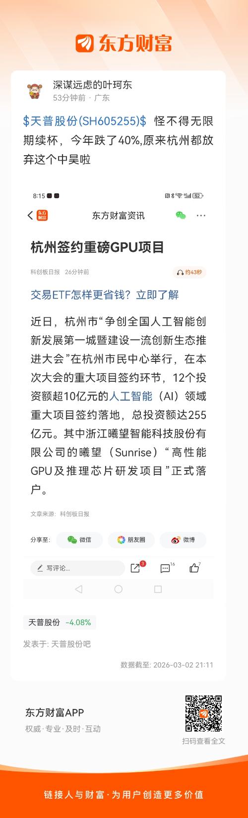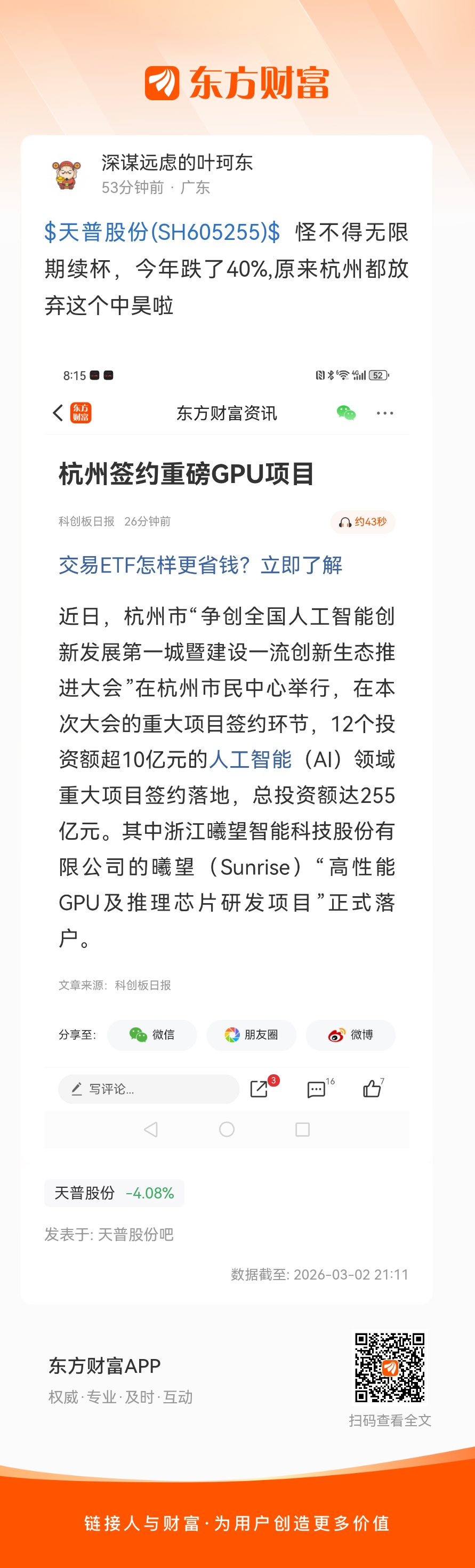 $天普股份(SH605255)$  怪不得无限期续杯,今年跌了40%,原来杭州都放弃这个中昊啦