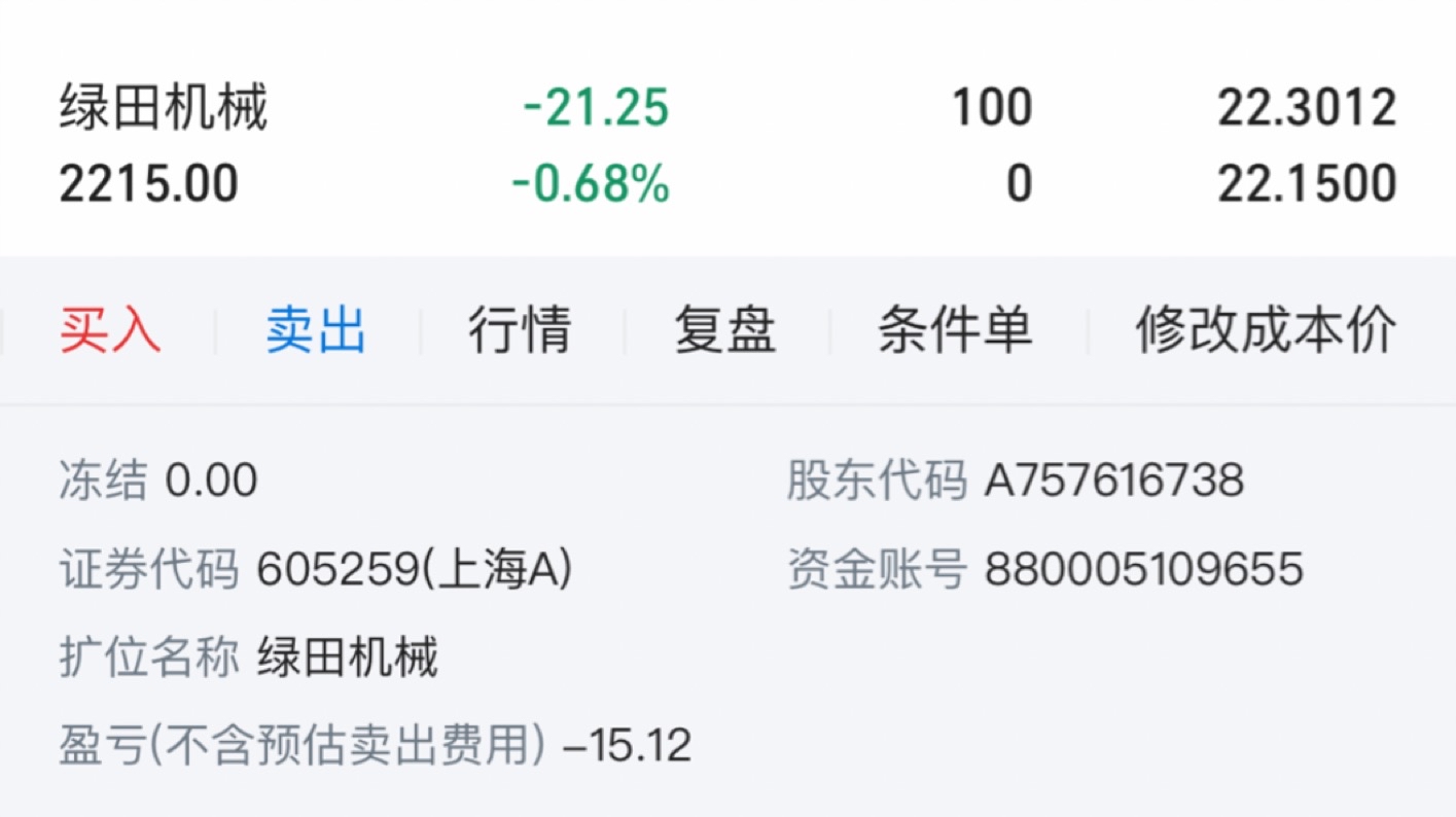 $绿田机械(SH605259)$ 今天买了就亏25,一包烟没了