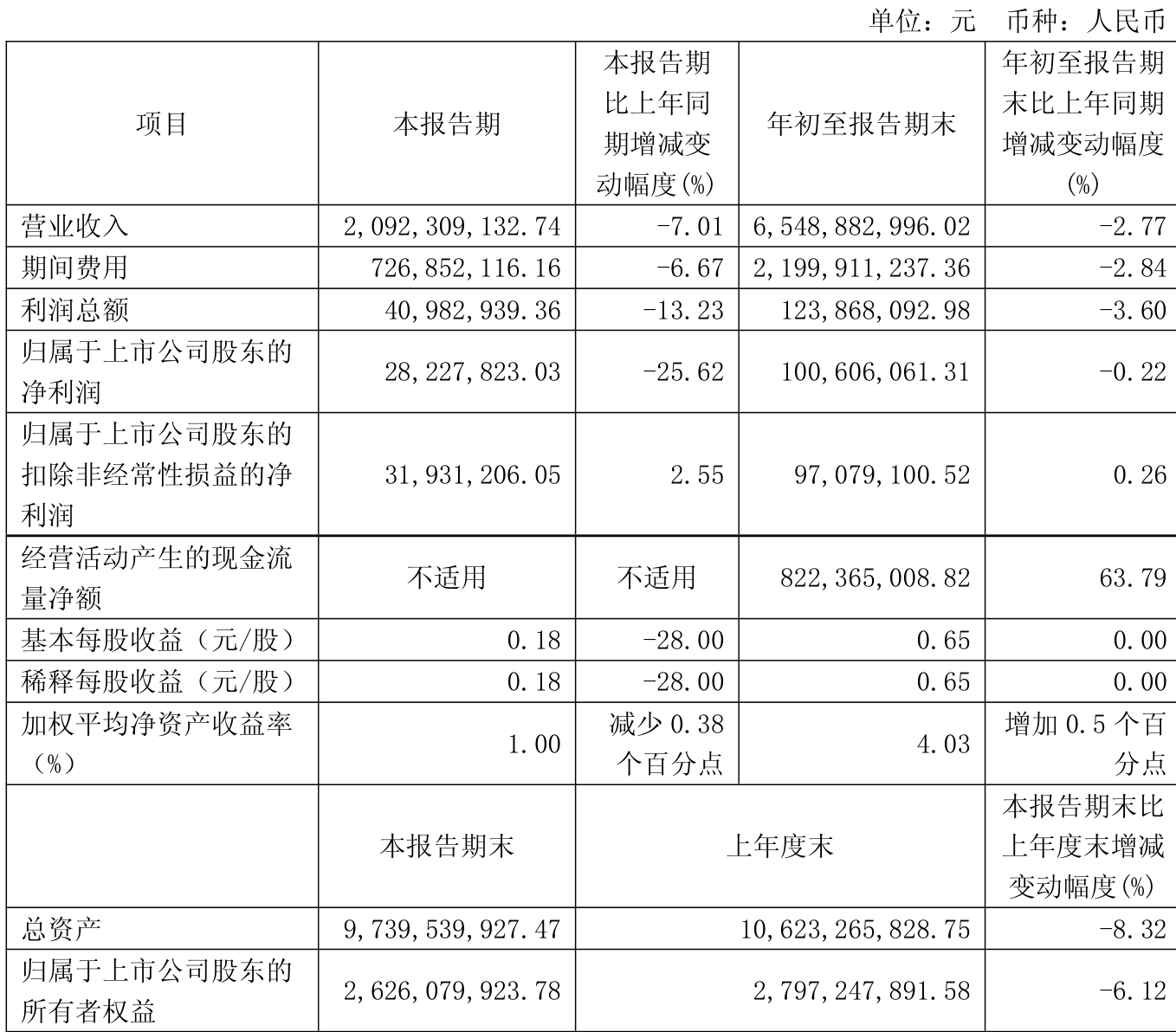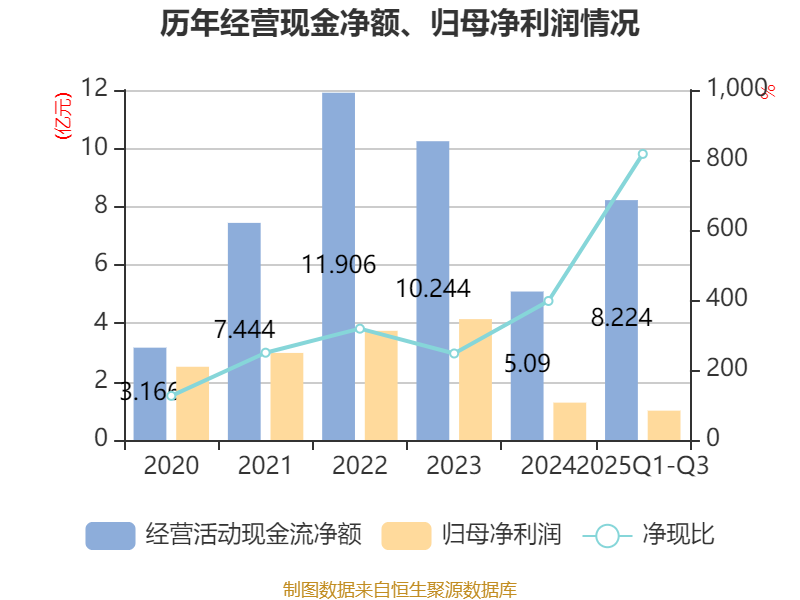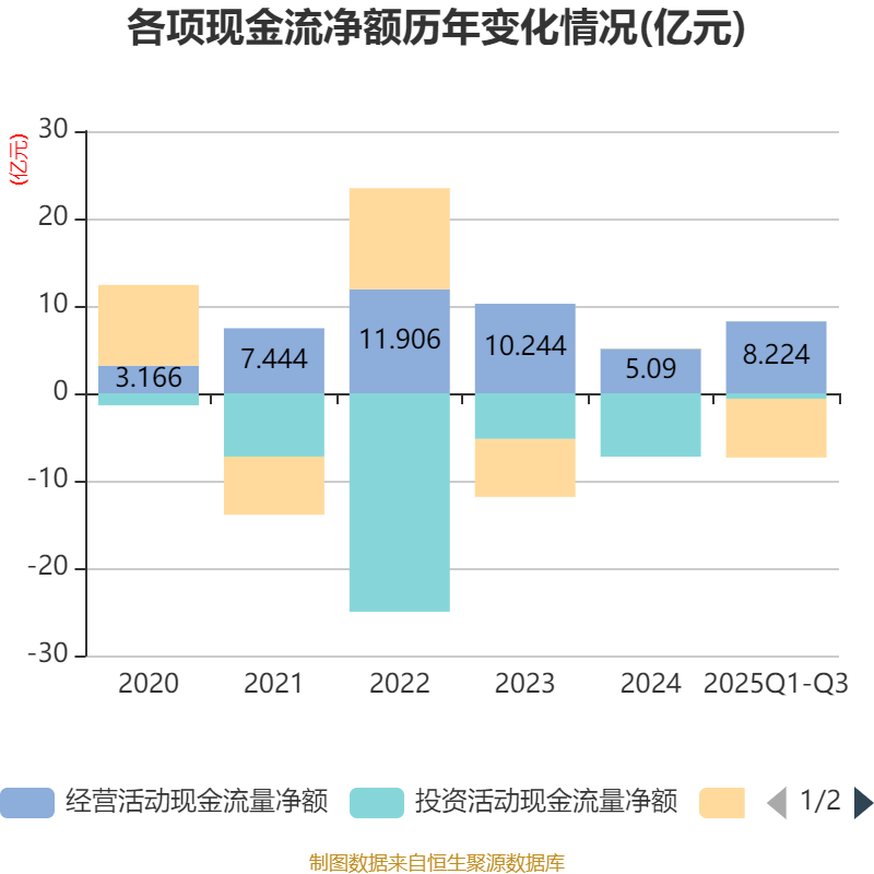 2025年前三季度,公司经营活动现金流净额为8.22亿元,同比增长63.79%;筹资活动现金流净额-6.73亿元,同比减少6.61亿元;投资活动现金流净额-6189.84万元,上年同期为-6.53亿元。