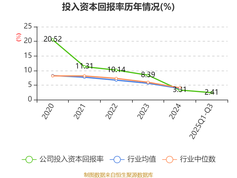 盈利能力方面, 2025年前三季度公司加权平均净资产收益率为4.03%,同比上升0.5个百分点。公司2025年前三季度投入资本回报率为2.41%,较上年同期下降0.15个百分点。