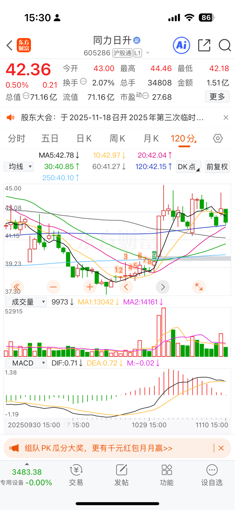 $同力日升(SH605286)$ 120分钟死叉、明天跳空低开补40缺口、补完考虑进一点