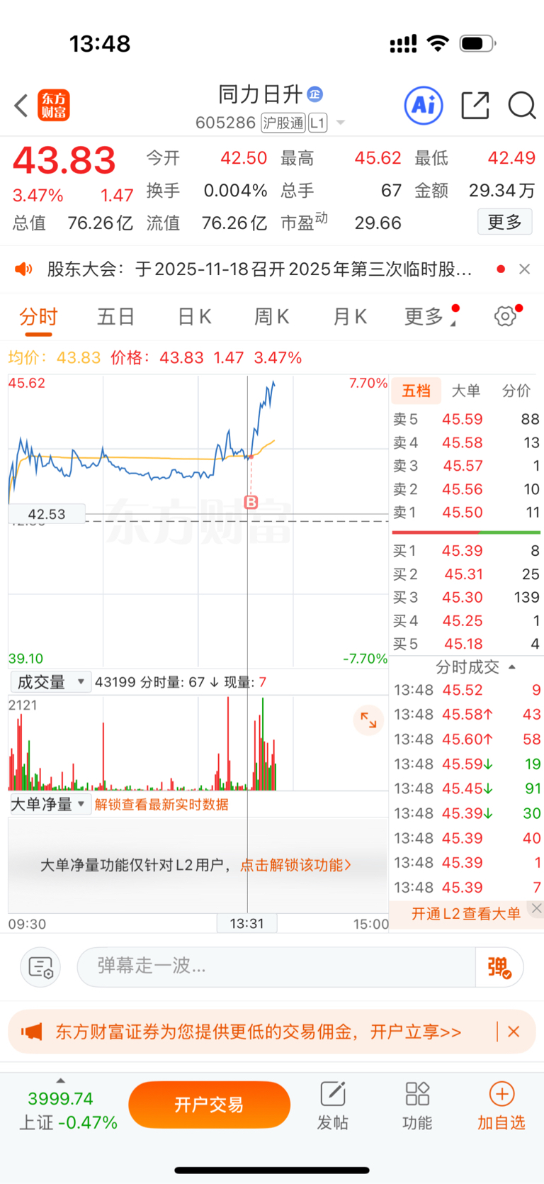 午盘43.83介入$同力日升(SH605286)$ #强势机会# #实盘记录# #投资干货# #投资随笔#
