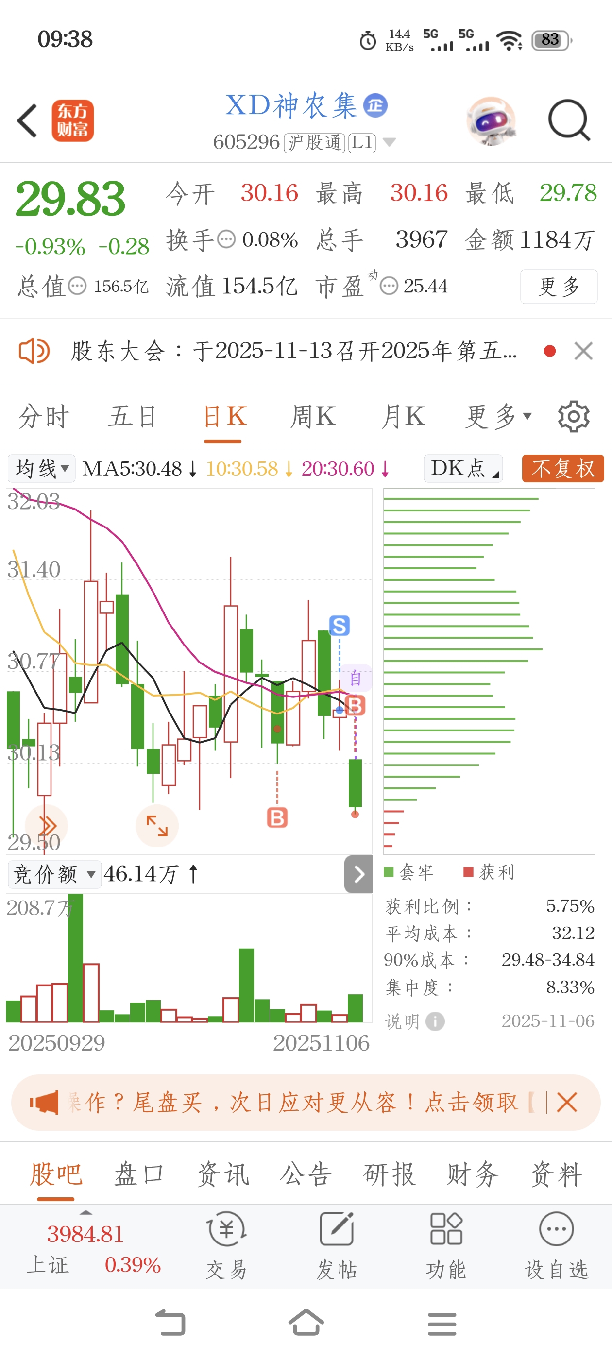 $XD神农集(SH605296)$ 昨天卖了躲分红,今天又买进来了!就知道分红那三瓜俩子的不够你今天下跌的