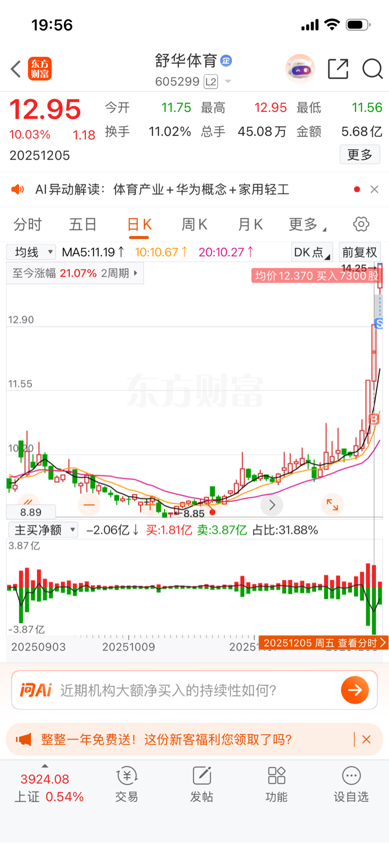 $舒华体育(SH605299)$ 赚了13000,已走,谢谢主力。