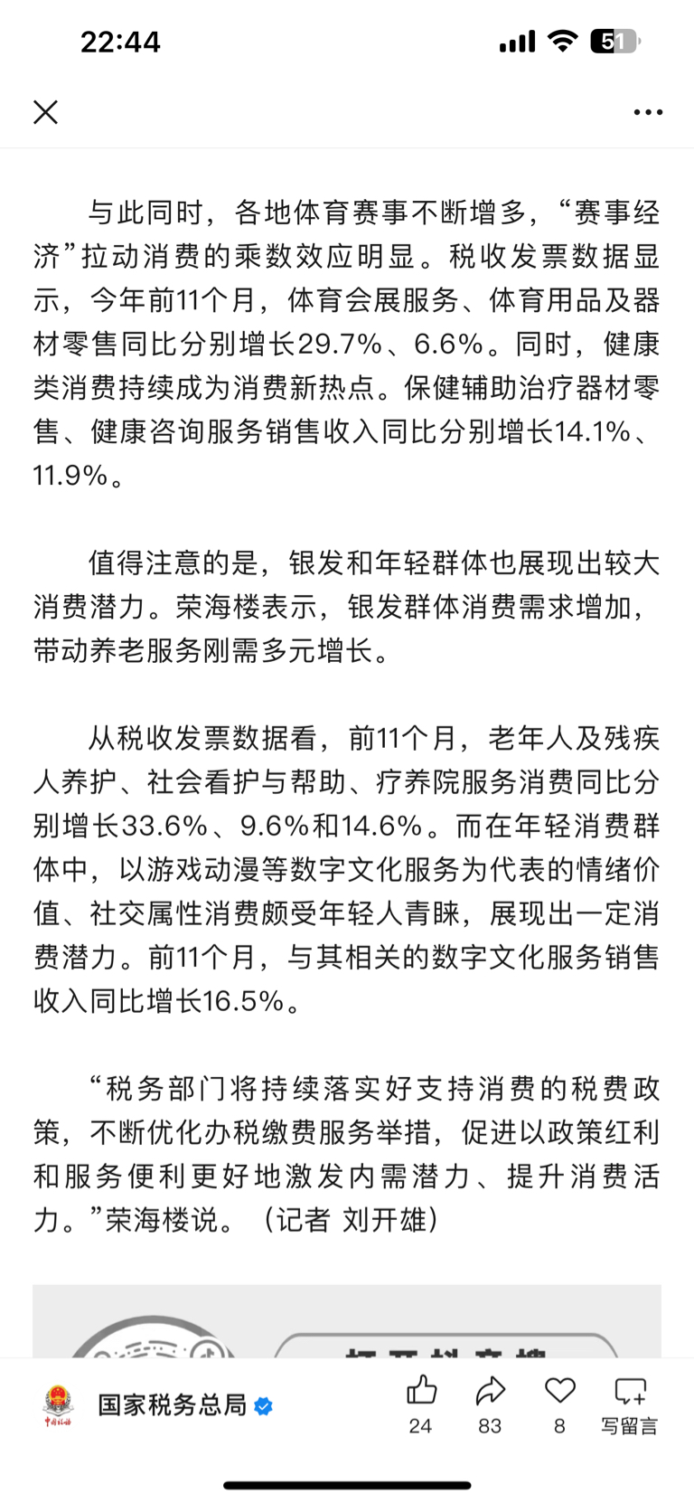 今年前11个月,体育会展服务、体育用品及器材零售同比分别增长29.7%、6.6%。同时,健康类消费持续成为消费新热点。保健辅助治疗器材零售、健康咨询服务销售收入同比分别增长14.1%、11.9%。值得注意的是,银发和年轻群体也展现出较大消费潜力。荣海楼表示,银发群体消费需求增加,带动养老服务刚需多元增长。