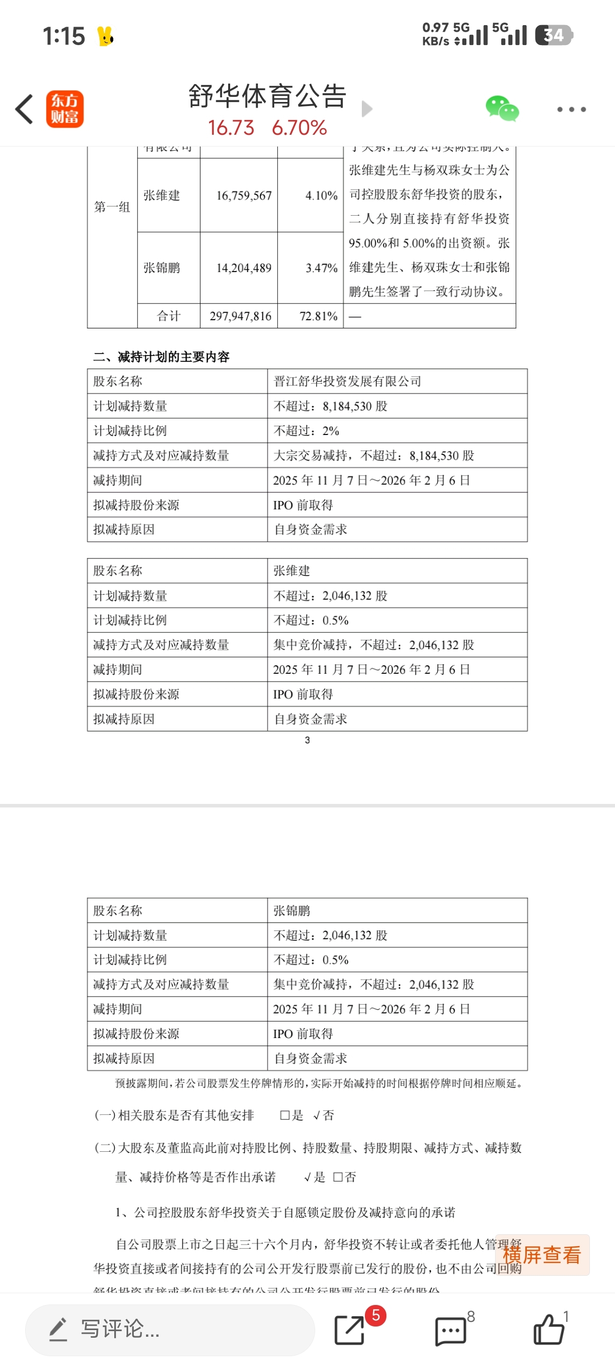 $舒华体育(SH605299)$ 一个2%大宗减持,一个0.5%和一个0.5%集中竞价减持,龙虎榜开泉州的连续三天卖出,应该出完集中竞价的,还有大宗减持的8w多手今天估计卖完,