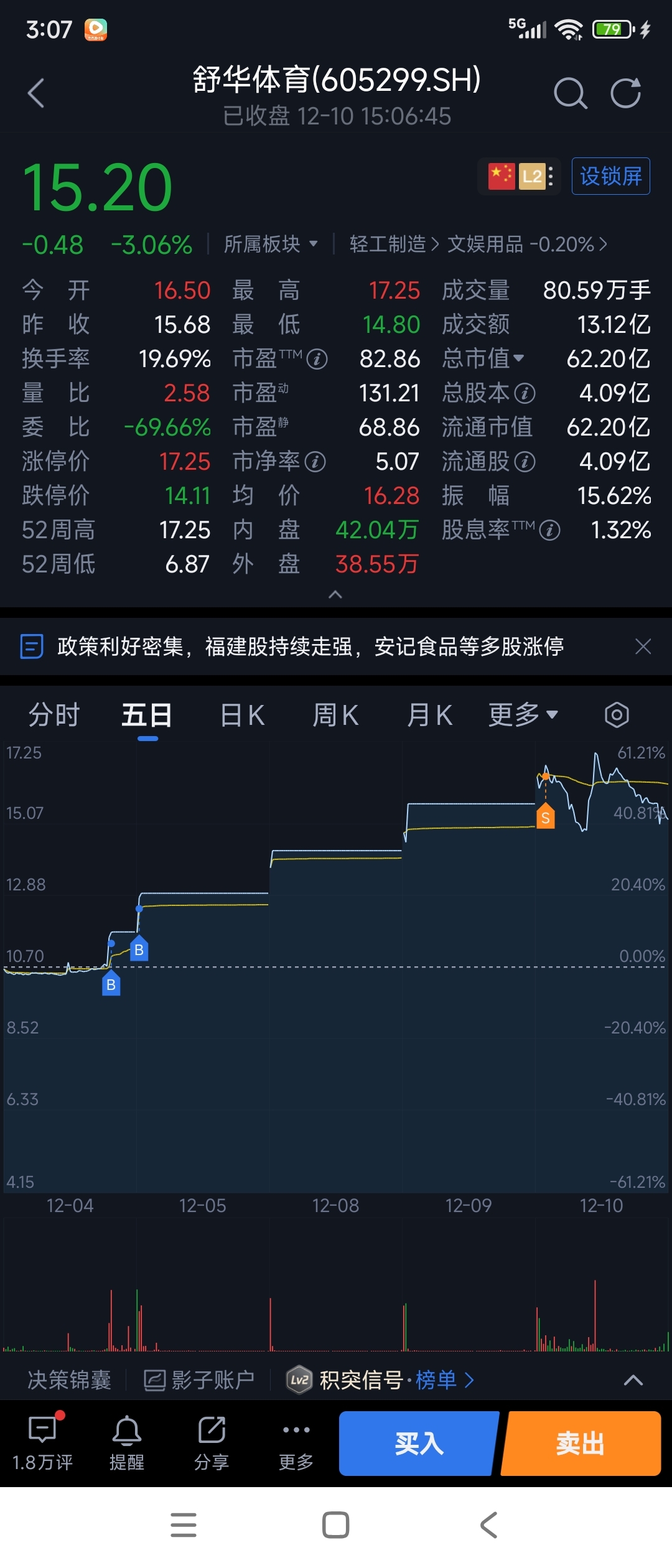 $舒华体育(SH605299)$ 获利了结了,感谢