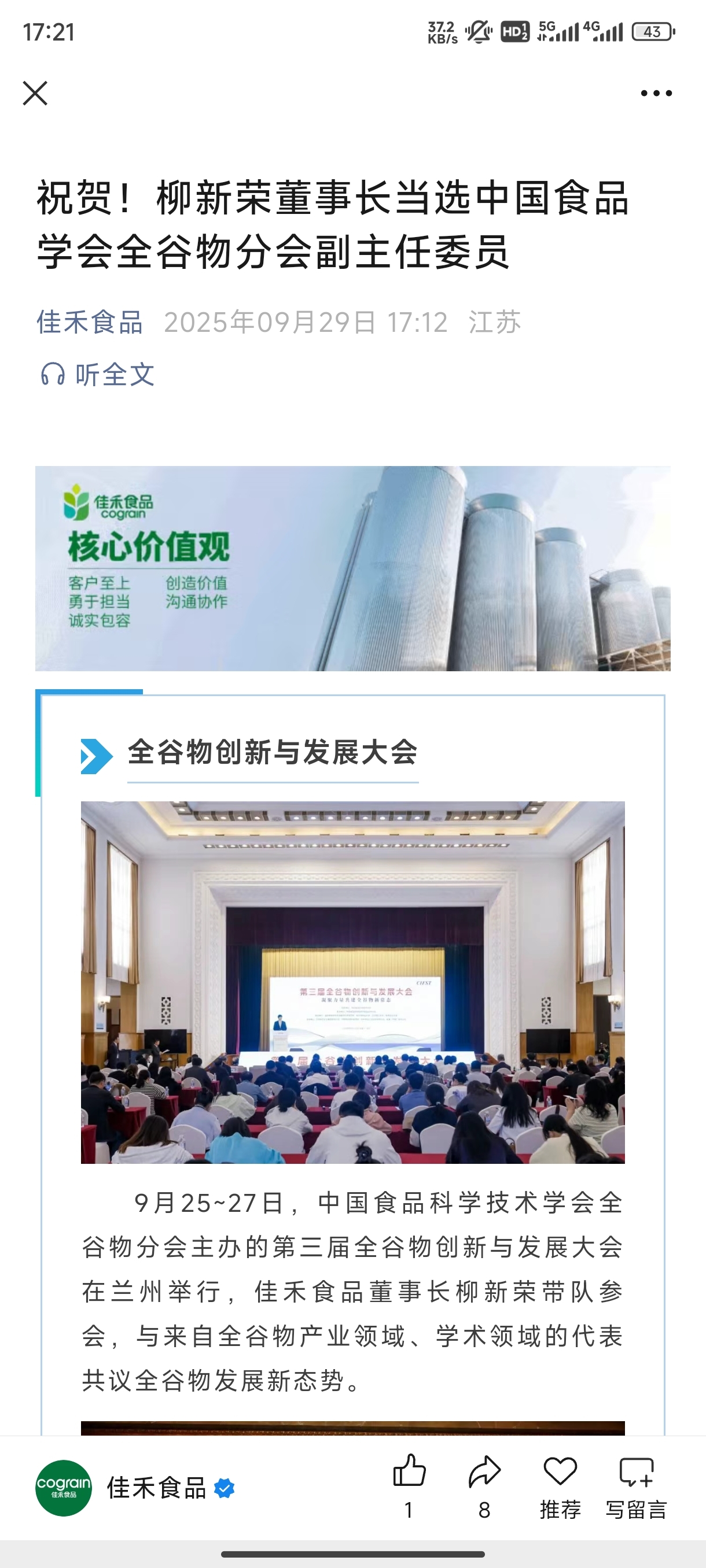 $佳禾食品(SH605300)$ 股价?不来个涨停庆祝一下?