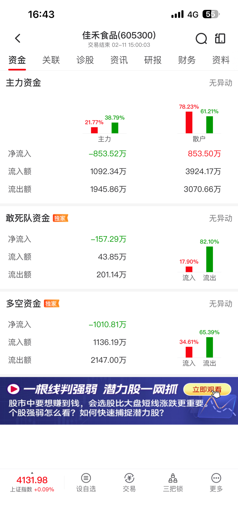 $佳禾食品(SH605300)$ 今天主力又跑不少