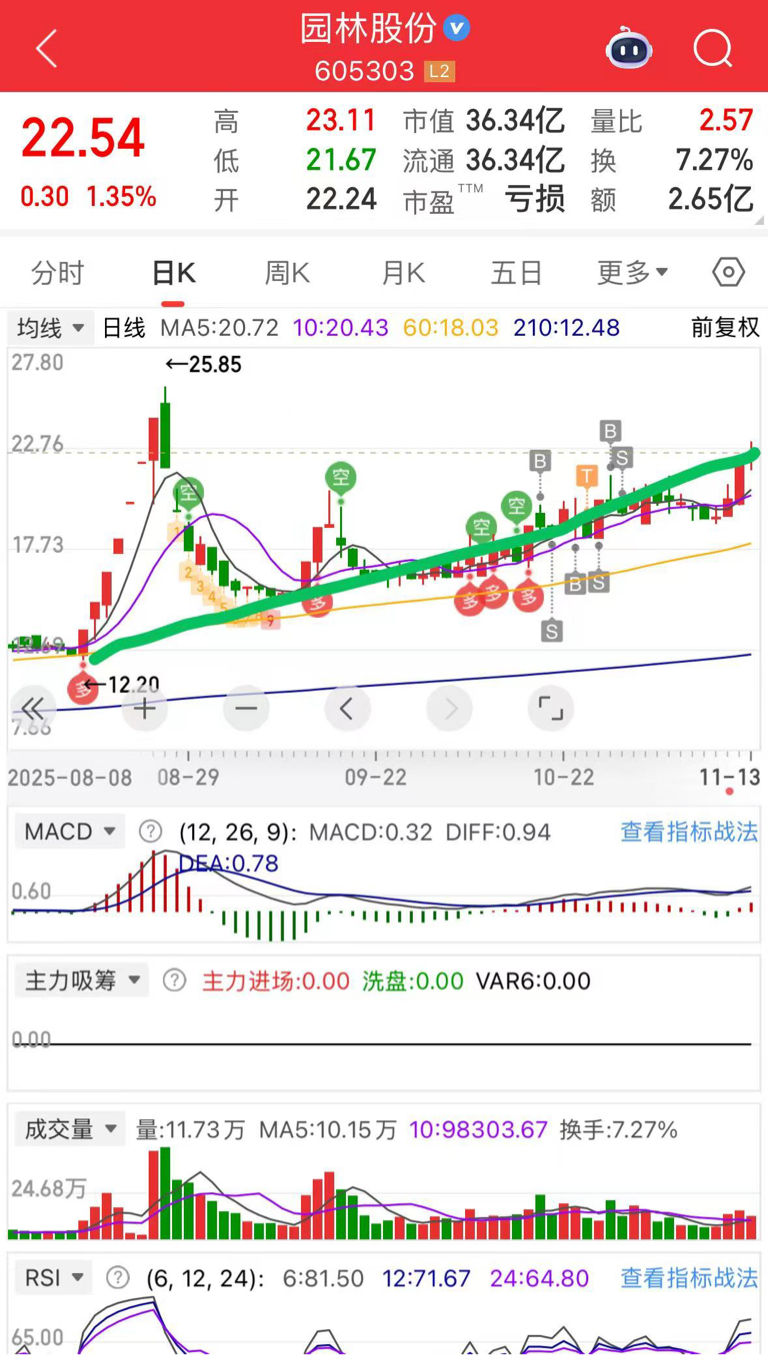 $园林股份(SH605303)$ 看下午能突破道氏趋势线不,放量突破就进入主升通道。