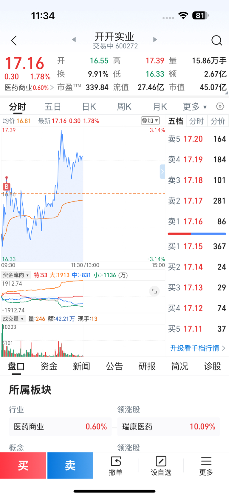 没能在最高点卖,十几个点也可以了,还要洗两天再回来,同样的手法去买了开开,继续吃