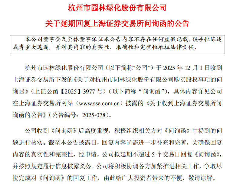 12月8日,园林股份(605303)发布公告,公司于12月1日收到上海证券交易所下发的《关于对杭州市园林绿化股份有限公司购买股权事项的问询函》。