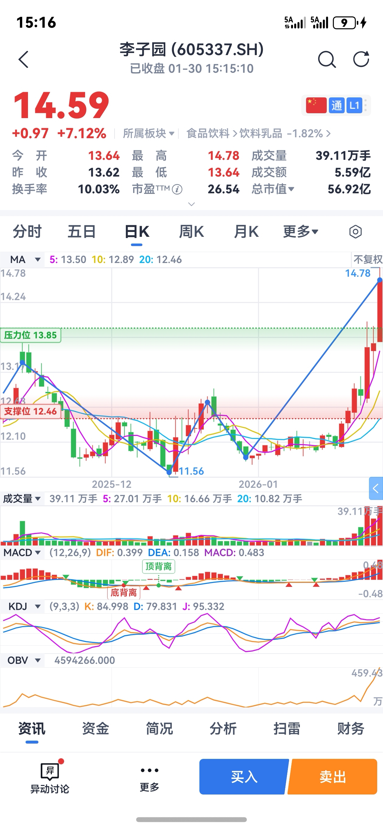 $李子园(SH605337)$ 前天放量突破平台压力位,昨天缩量回踩确定,今天再次放量站稳,年前都还有得搞…#农业板块突然暴走,资金开启防守模式?# $农业种植(BK0888)$