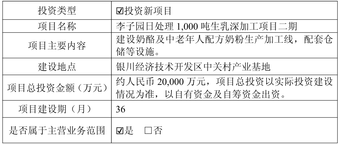 3月4日晚间,李子园(605337)发布公告称,公司的全资子公司宁夏李子园与银川经济技术开发区管理委员会签署《项目投资协议书》,在银川经济技术开发区对现有“李子园日处理1000吨生乳深加工项目”进行扩建,建设“李子园日处理1000吨生乳深加工项目二期”。