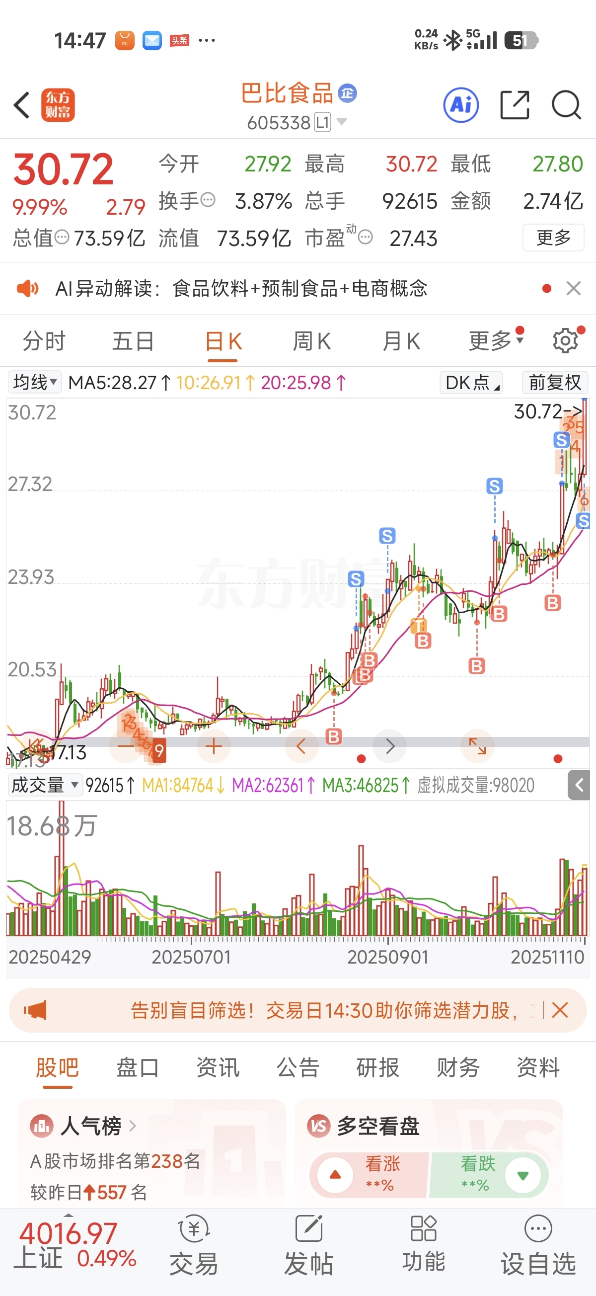 $巴比食品(SH605338)$ 持仓88天