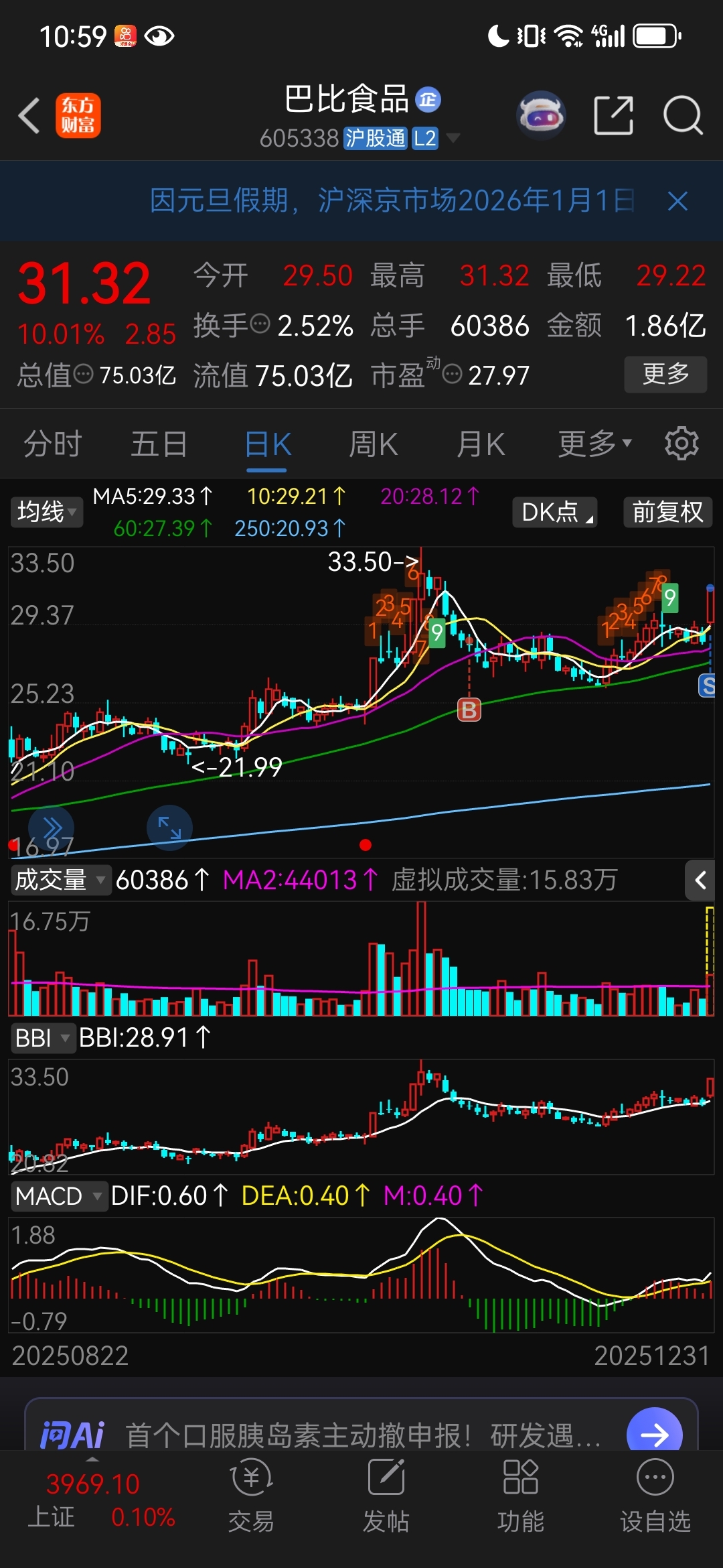 $巴比食品(SH605338)$ 拿了这么久,吃了个涨停走了,本来当时买的时候觉得可以走双头,没想到调了这么久,怎么也得破个前高。但是消费真的是玩不来,总是很让人失望,一季度还是不参与了。
