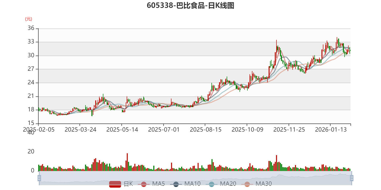 中证智能财讯巴比食品(605338)2月3日晚间披露2025年业绩快报,公司实现营业收入18.59亿元,同比增长11.22%;归母净利润2.73亿元,同比下降1.30%;扣非净利润2.45亿元,同比增长16.49%;基本每股收益1.14元,加权平均净资产收益率为12.05%。以2月3日收盘价计算,巴比食品目前市盈率(TTM)约为27.29倍,市净率(LF)约3.29倍,市销率(TTM)约4.1倍。