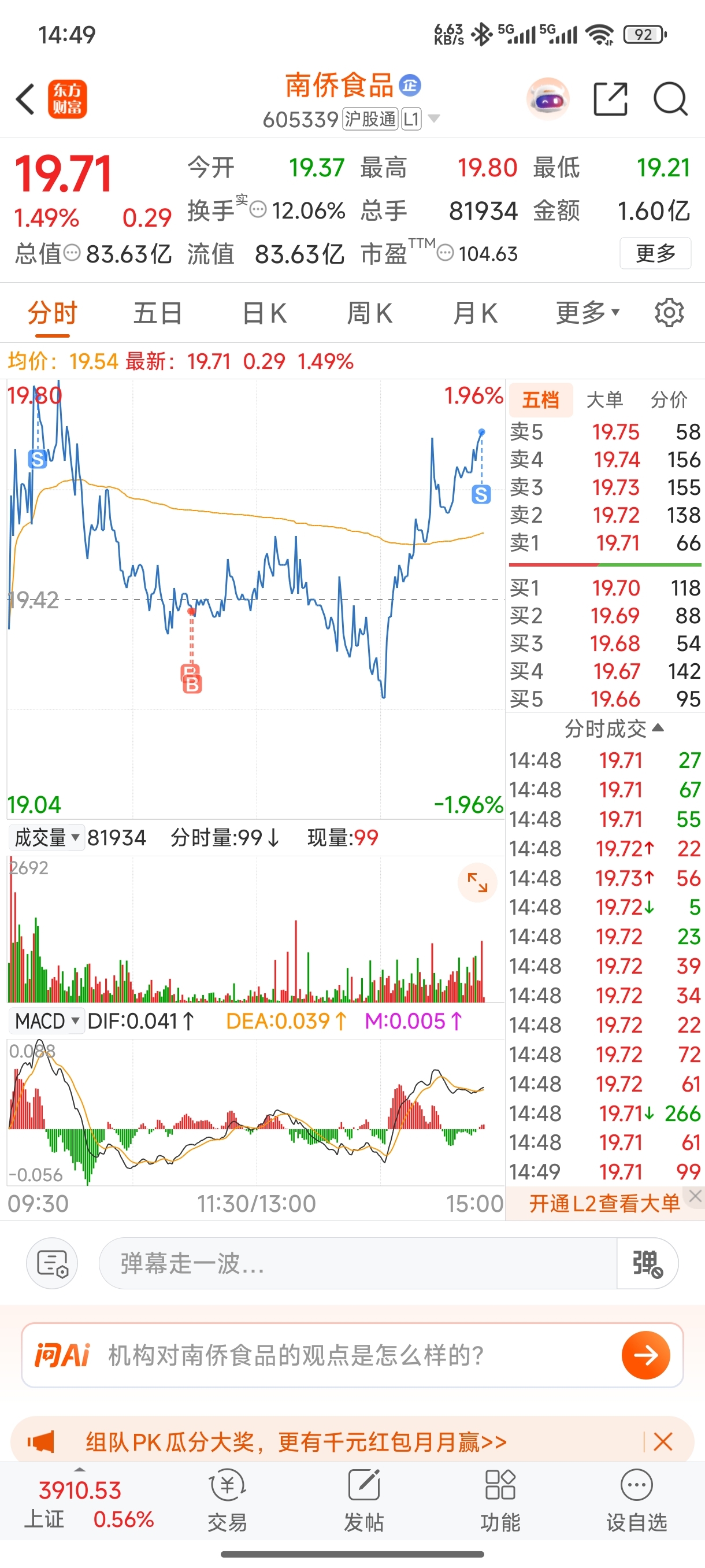 $南侨食品(SH605339)$ 今日打猎结束,收工
