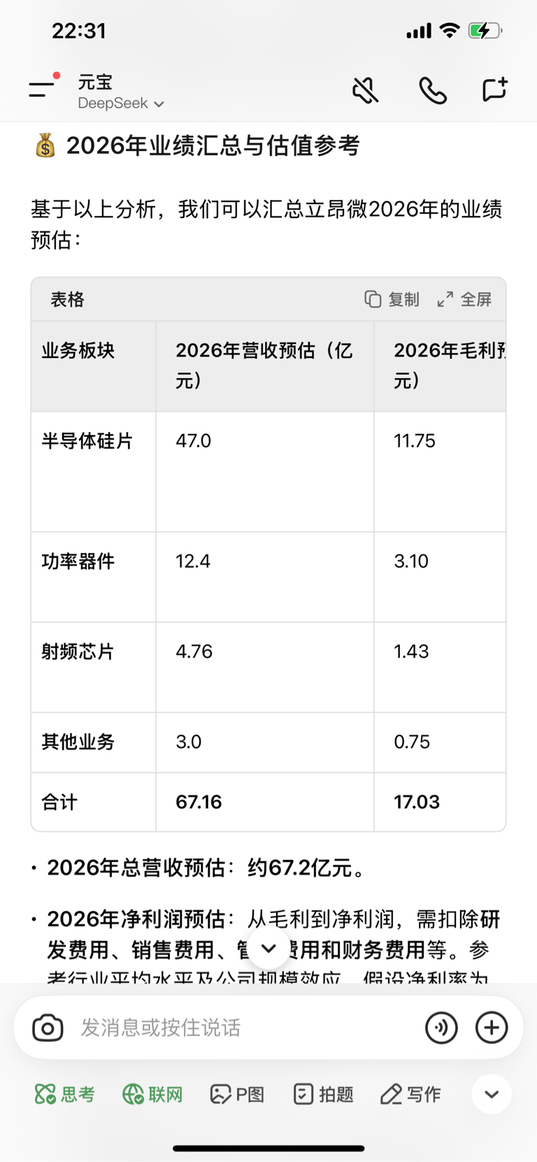 $立昂微(SH605358)$ 让元宝推算2026年业绩和利润真费事,问了几十遍,才会自己推算,而不是读研报。立昂微的硅片和芯片(hbm存储,激光雷达的vcsel芯片,低轨卫星射频芯片等,哪个不是当下热点和国家战略),只是不知道资本市场是短期拉升一倍还是来回折腾到明年。