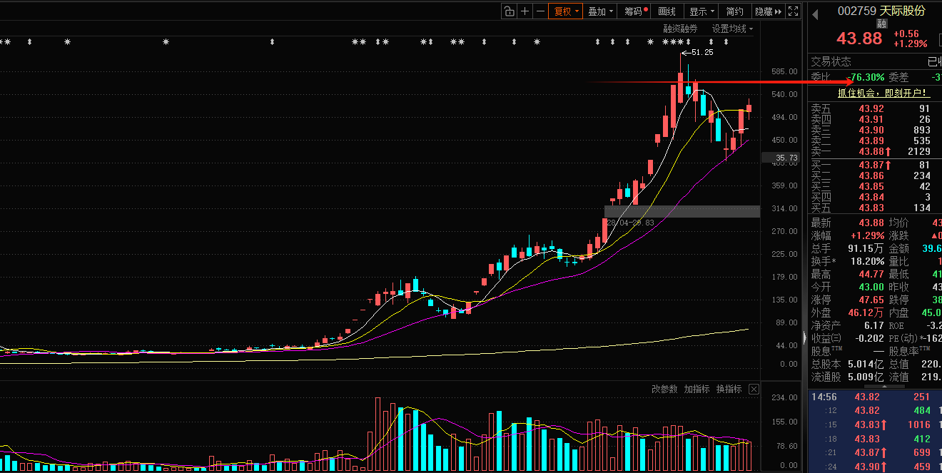 天际股份002759:锂电池概念,这里由于对整个板块具有积极的影响,所以今天正常调整后大概率还有一次冲高,所以看明天能否触及前高附近。