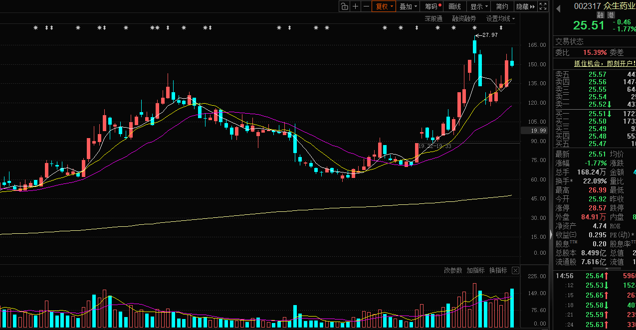 众生药业002317:流感板块,这个昨天故意不封,今天上午拉升的时候有点无力的感觉,所以破分时的时候撤了,现在回头看看,似乎没做好,毕竟这方向还是防守品种。也许明天就会有反包出现的,不过既然撤了就不看了。