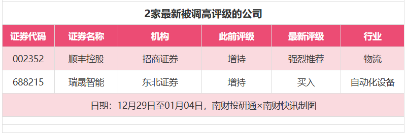 评级调高方面,12月29日至1月4日,券商调高上市公司评级达到2家次,最新数据包括了招商证券对顺丰控股的评级从“增持”调高至“强烈推荐”,东北证券对瑞晟智能的评级从“增持”调高至“买入”。