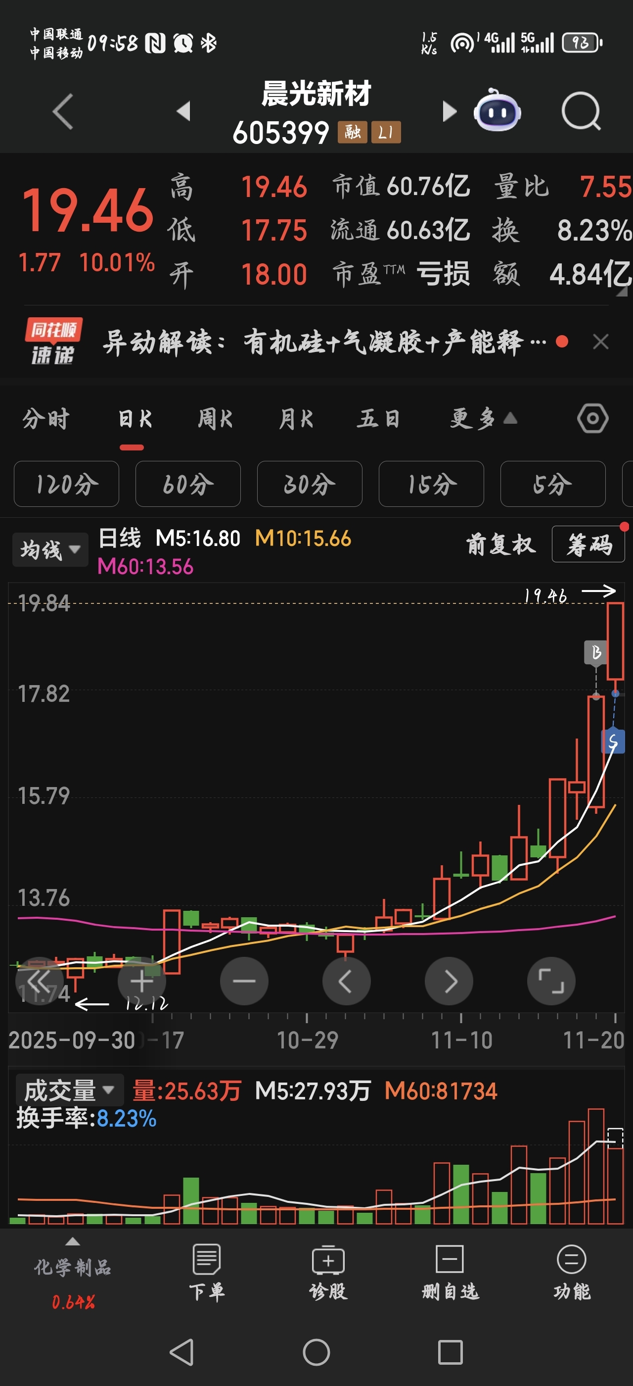 $宏柏新材(SH605366)$ $晨光新材(SH605399)$ 行情不佳,大盘是天天收红,却是跌四千多家,成交量是越来越少了,今天决定都获利了结,晨光新材有机硅龙头还留点,封单太少,太累了,钱根本赚不完,尽管这个月做得还可以但还是敬畏市场,